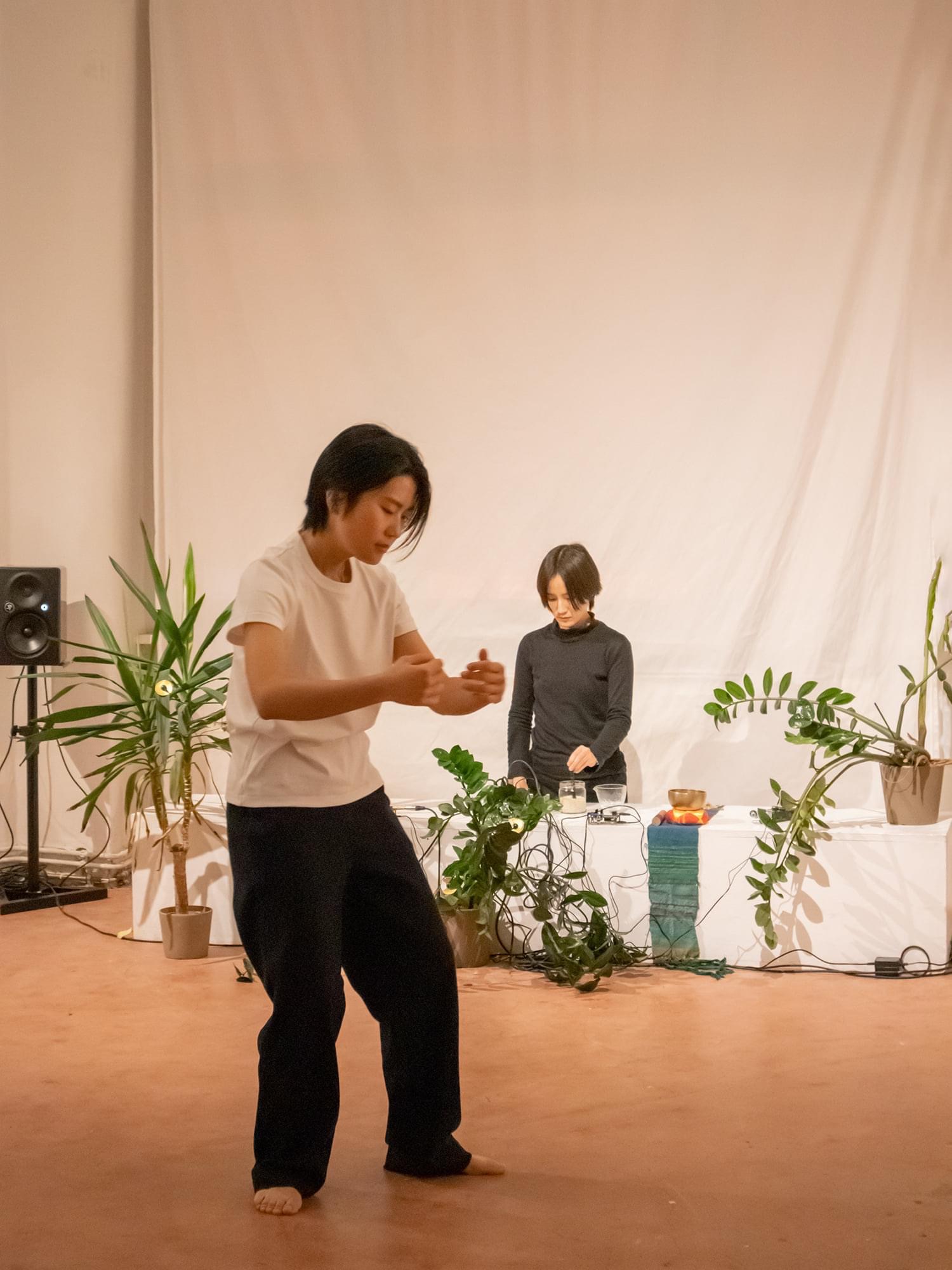 On the first day, November 30, 2021, the performance "Hearing the Sunrise," a cooperation with media artist, programmer and researcher Qianxun Chen took place. As Huiquan performed, Qianxun provided an ambient listening experience by using multiple Soniplasts on plants, a device that translates biodata from plants into audio.